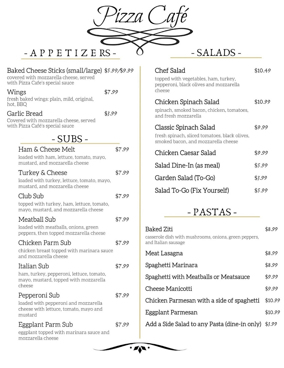 What truly sets Pizza Cafe apart is the blend of flavors and crust options—from crispy thin crusts to a hearty regular crust, there’s something for everyone. The baked cheese sticks and Manhattan calzone are mentioned as favorites, further showcasing the diverse menu. With friendly service and a cozy atmosphere, Pizza Cafe ensures a delightful dining experience worth savoring.